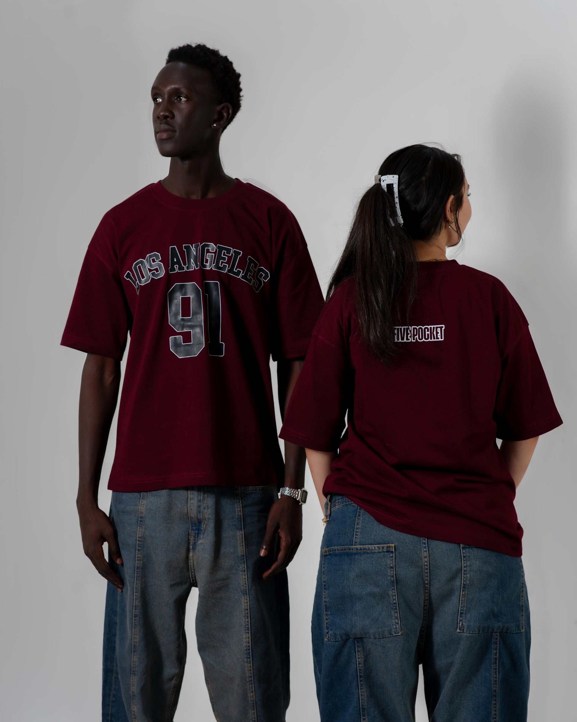 A maroon oversized t-shirt with bold "LOS ANGELES 91" varsity print on the front. Designed for a relaxed streetwear look, perfect for everyday wear and versatile styling.